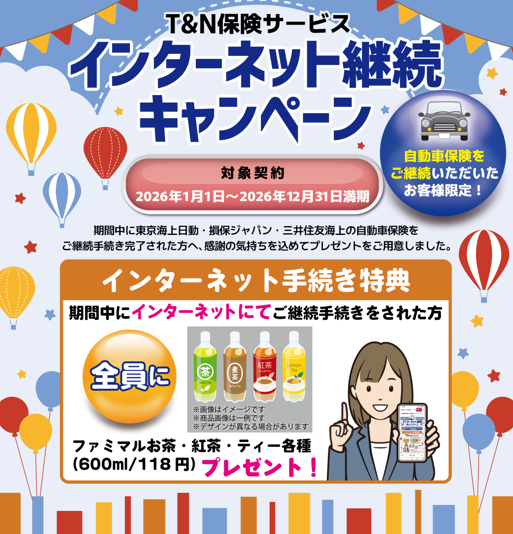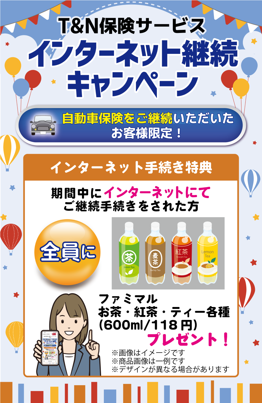 - 本キャンペーンは個人のお客様でインターネットで継続手続きをいただいた方が対象となり、一つの保険証券ごとに1枚の特典をプレゼントいたします。